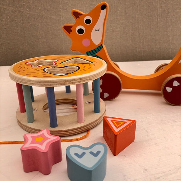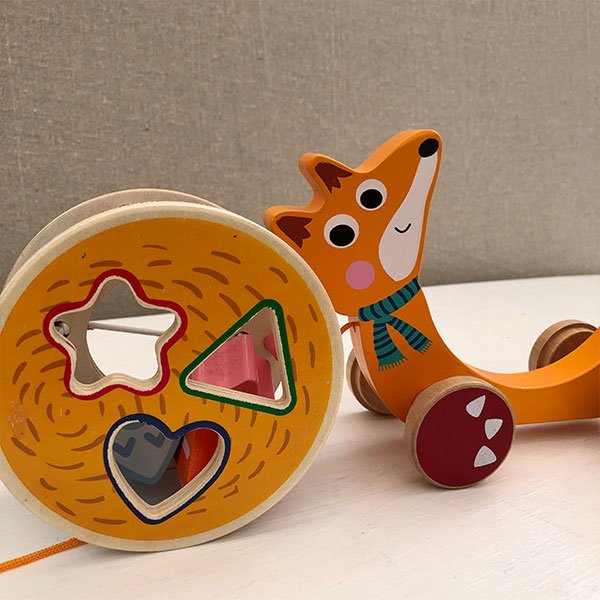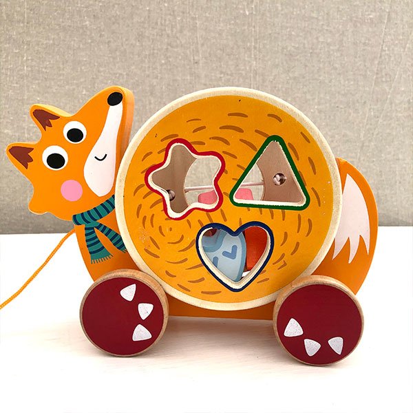 zorrito didáctico de arrastre, con cilindro de encajes desmontable. echo de madera.